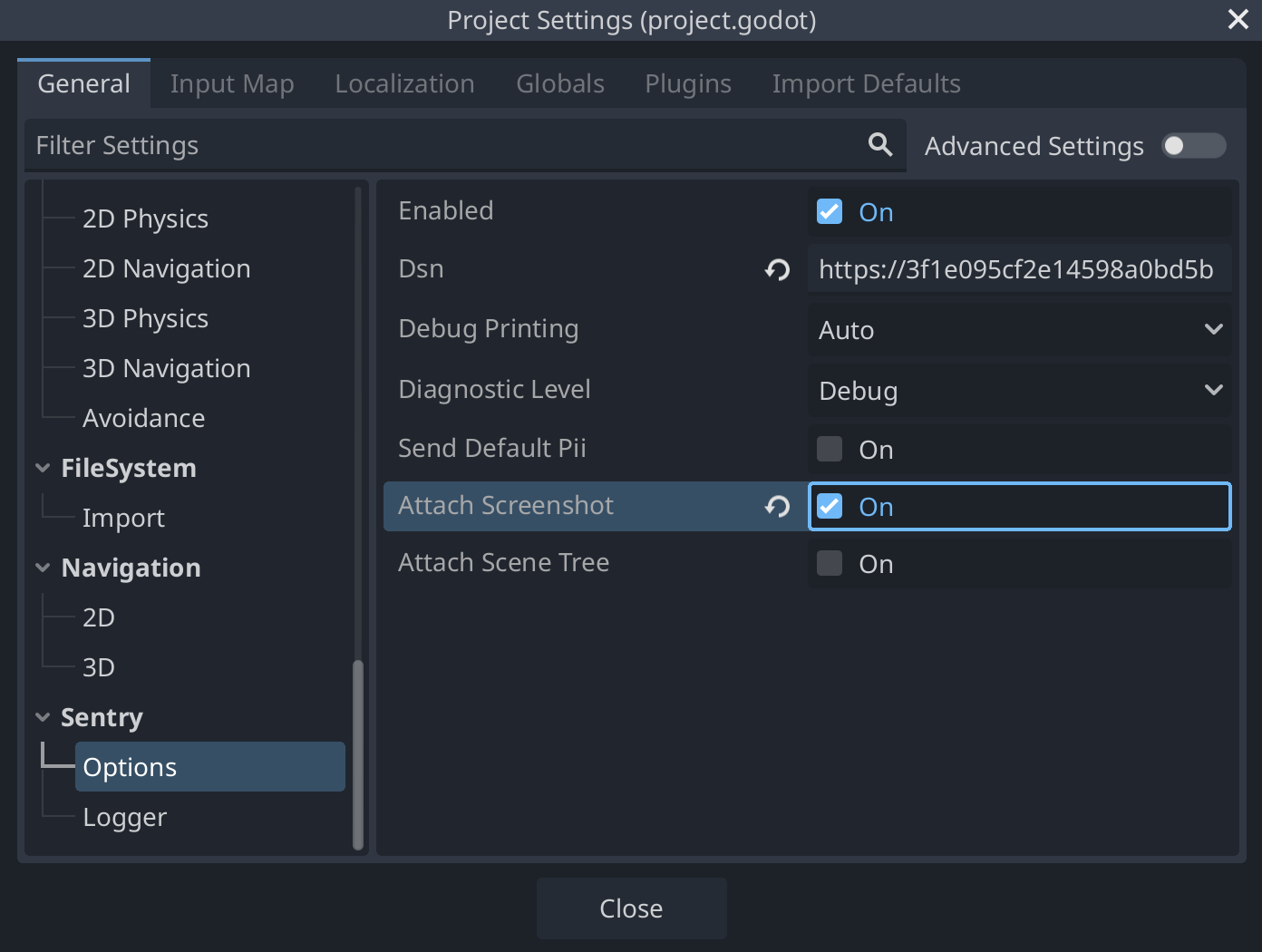 Because screenshots may contain PII, they are an opt-in feature. To attach screenshots to your events, navigate to Project Settings > Sentry > Options and enable the Attach Screenshot option: