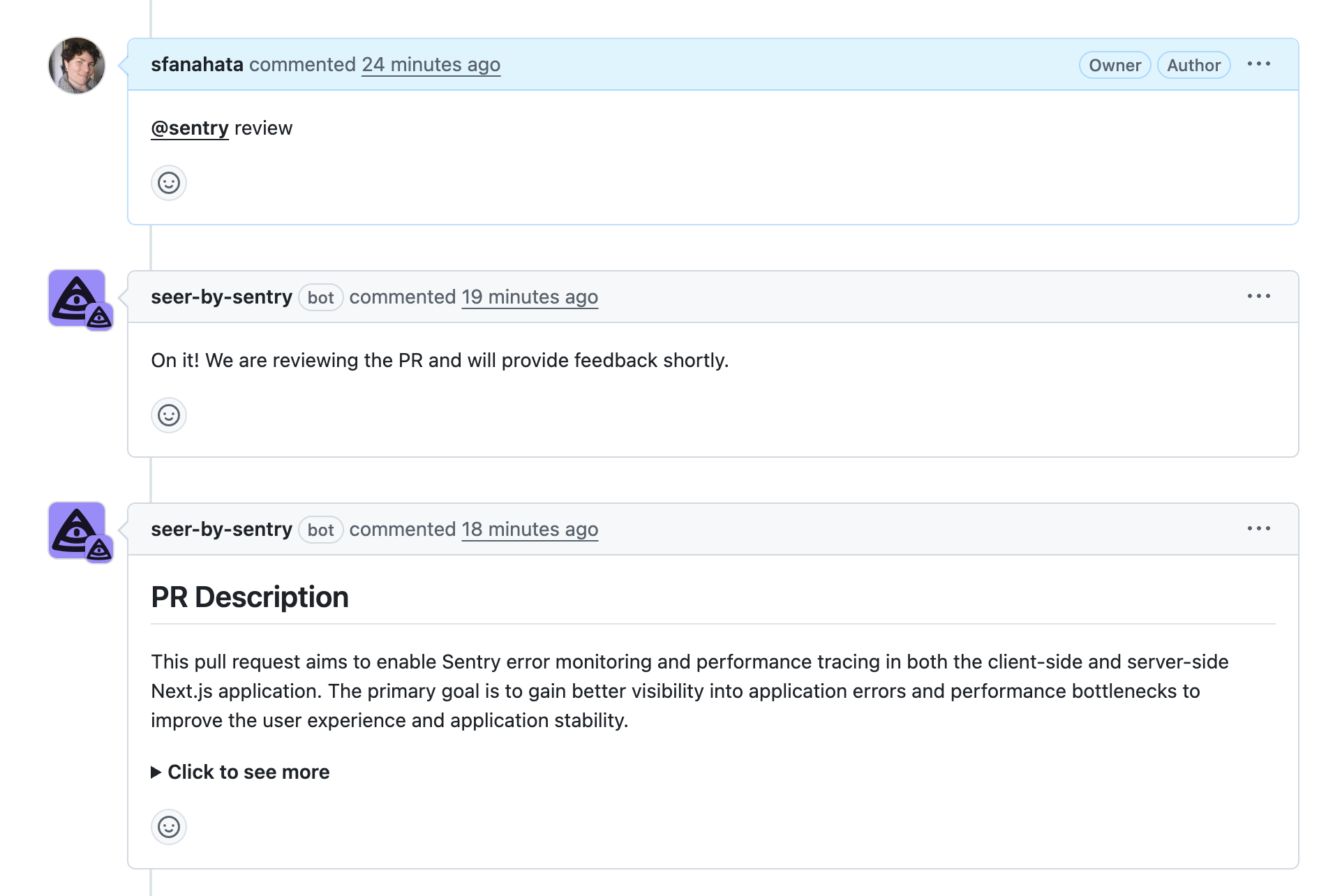 @sentrycommands working?Sentry Prevent AI will respond with a message to enable the