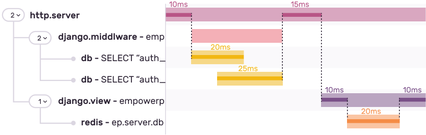 In the example below, the self time of each span is highlighted by the darker areas. For example, the http.server has a self time of 10ms + 15ms = 25ms.