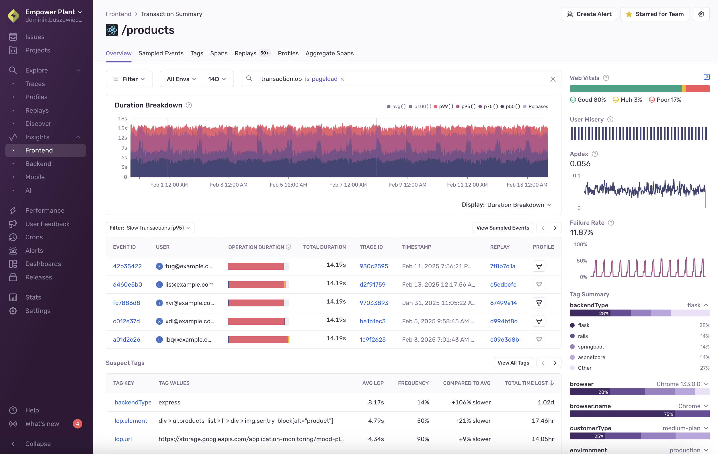 Transactions on the Insights Overview page are grouped by the transaction names, such as endpoint paths for backend request transactions (like /store/checkout/ or api/v2/users/<user_id>/) or URLs/routes for page load transactions (like https://docs.sentry.io/product/insights/). When you click a transaction on the Insights Overview page, it takes you to the Transaction Summary, where you can see a list of transaction events: that is, the individual instances of that specific transaction.