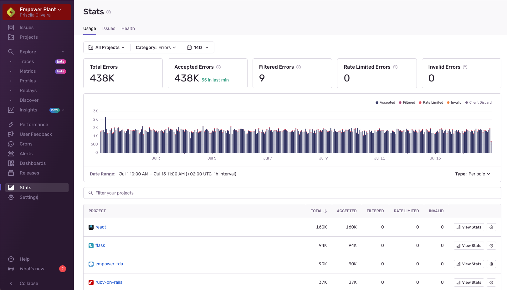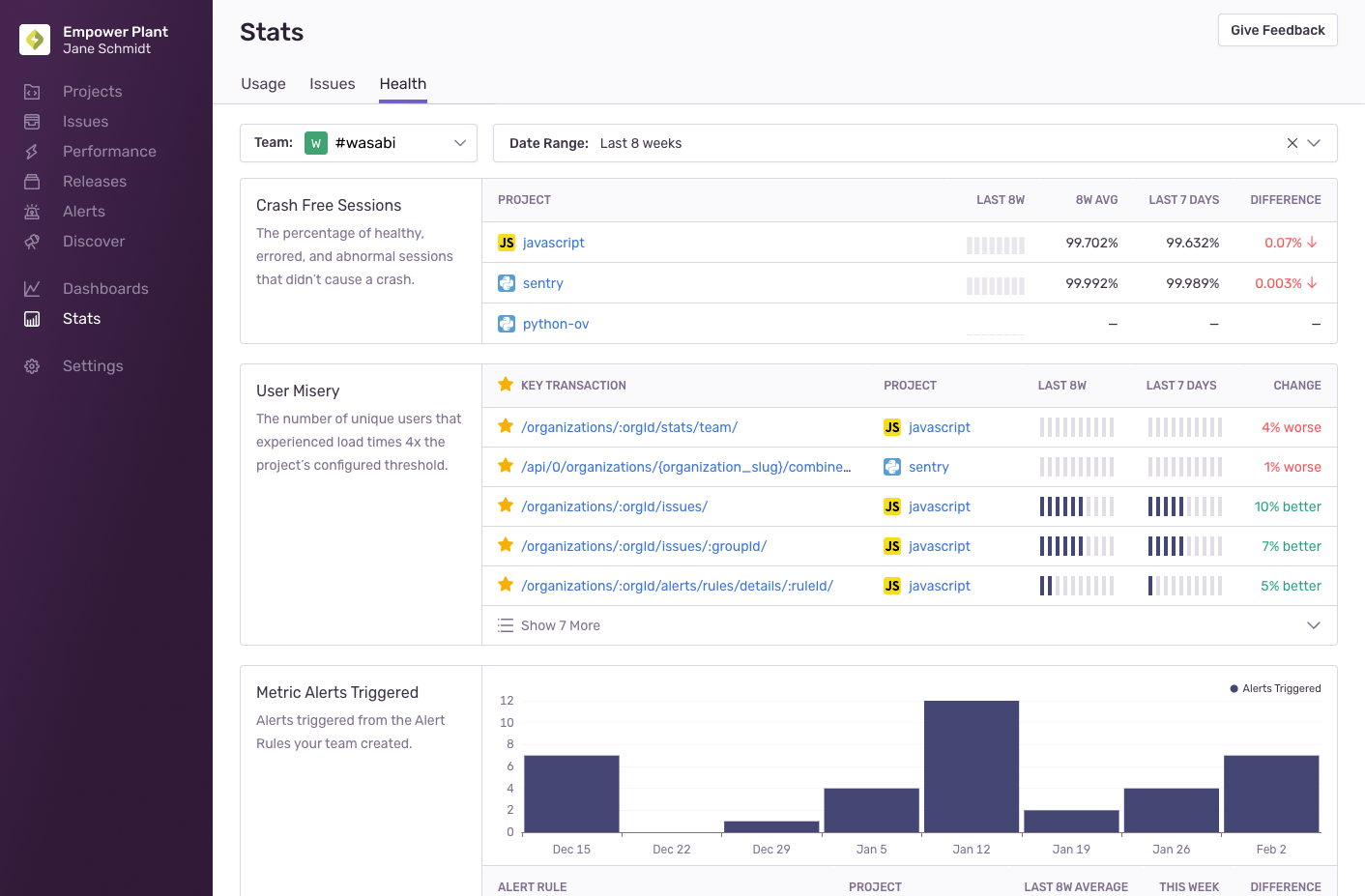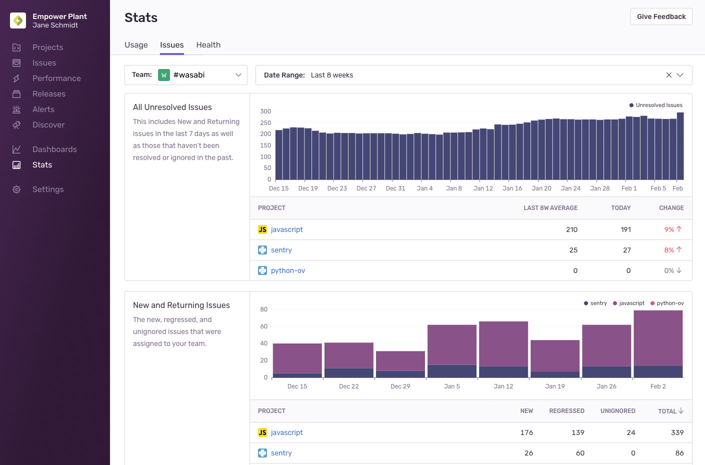 The Sentry Stats page displays important metrics such as Usage, and Issues that help teams track project health. Learn how to get started here.